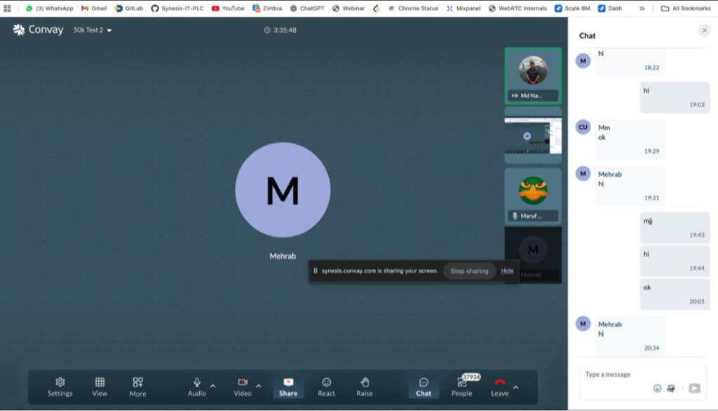 Convay Big Meeting is designed for large-scale interactive sessions where all participants can engage with video, audio, and collaboration tools — suitable for all-hands meetings, large training sessions, and interactive workshops up to 10,000 people. The Convay Webinar add-on is optimized for broadcast-style events with presenter controls, attendee view management, and event-specific infrastructure for one-to-many presentations up to 10,000 attendees.